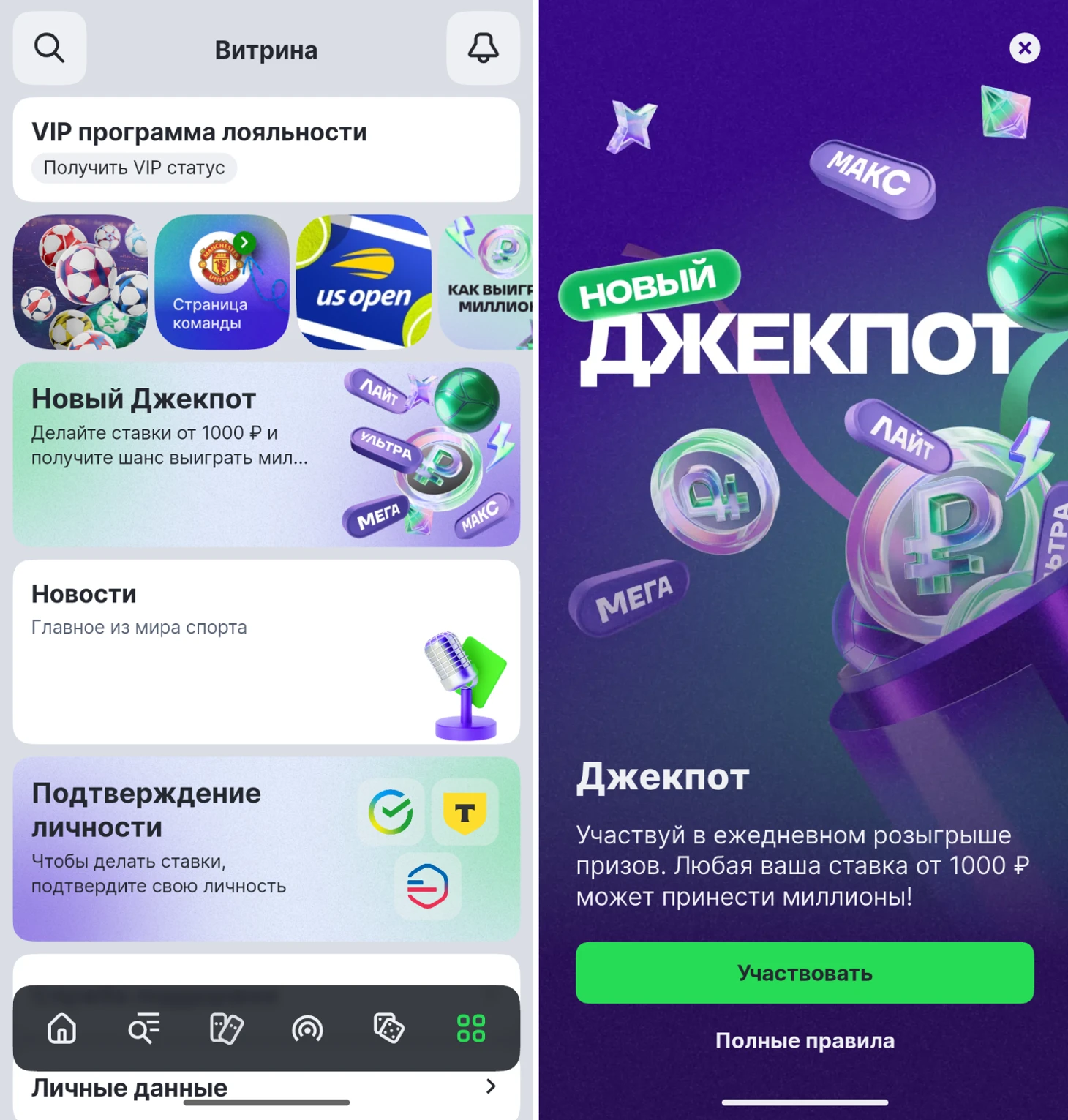 «Витрина». В этом разделе игрок может получить информацию о программе лояльности и самой компании, управлять своим аккаунтом и связаться со службой поддержки «Лиги Ставок».