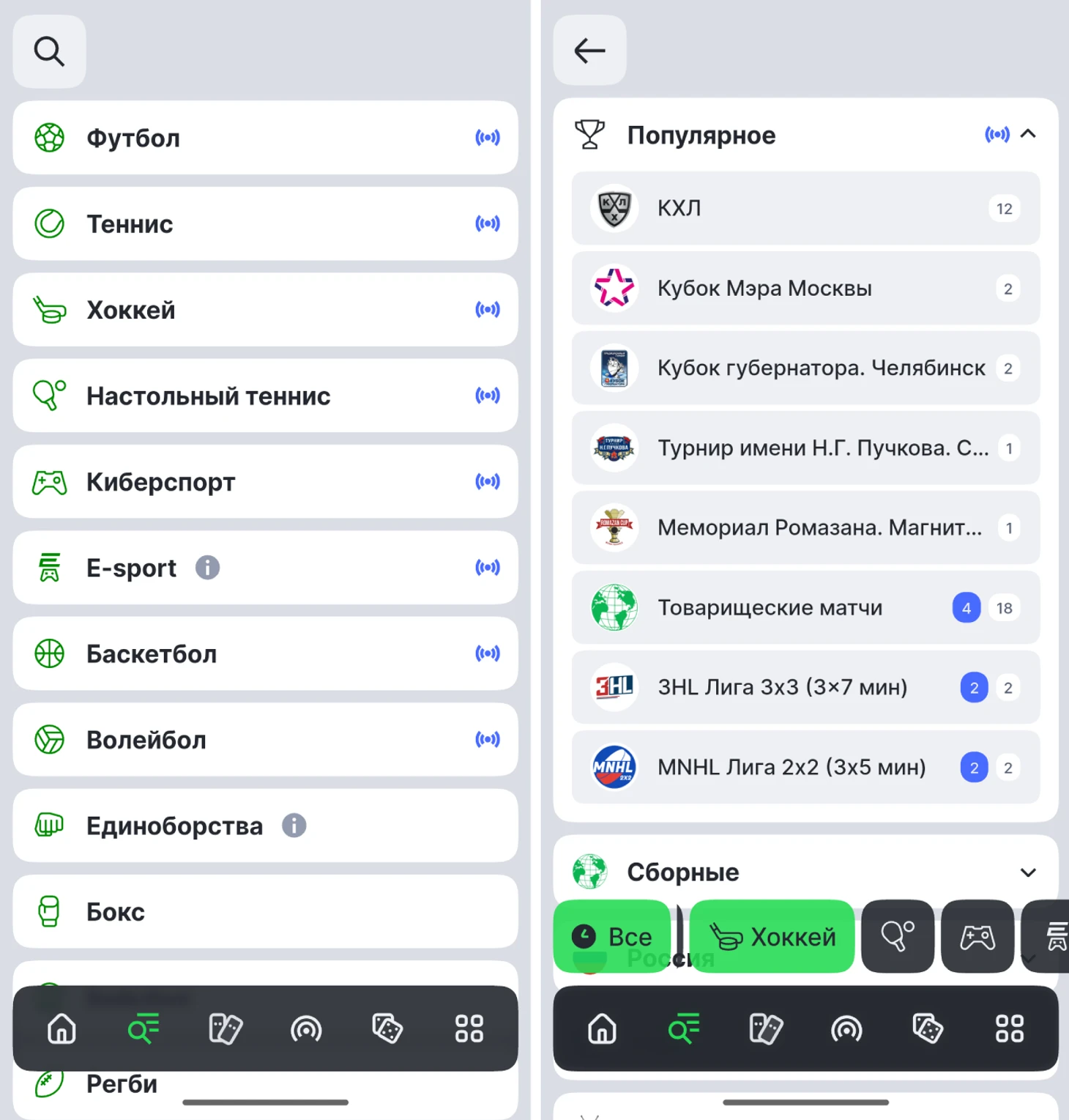 На вкладке «Главная» представлены Линия и Live. Все события, которые еще не стартовали, отсортированы по видам спорта. В линии представлено более 20 видов спорта, также работает поиск по названию. В прематче события ранжируются по рейтингу популярности: сначала идут топовые турниры вроде Лиги чемпионов, РПЛ или АПЛ, а затем – все остальные.