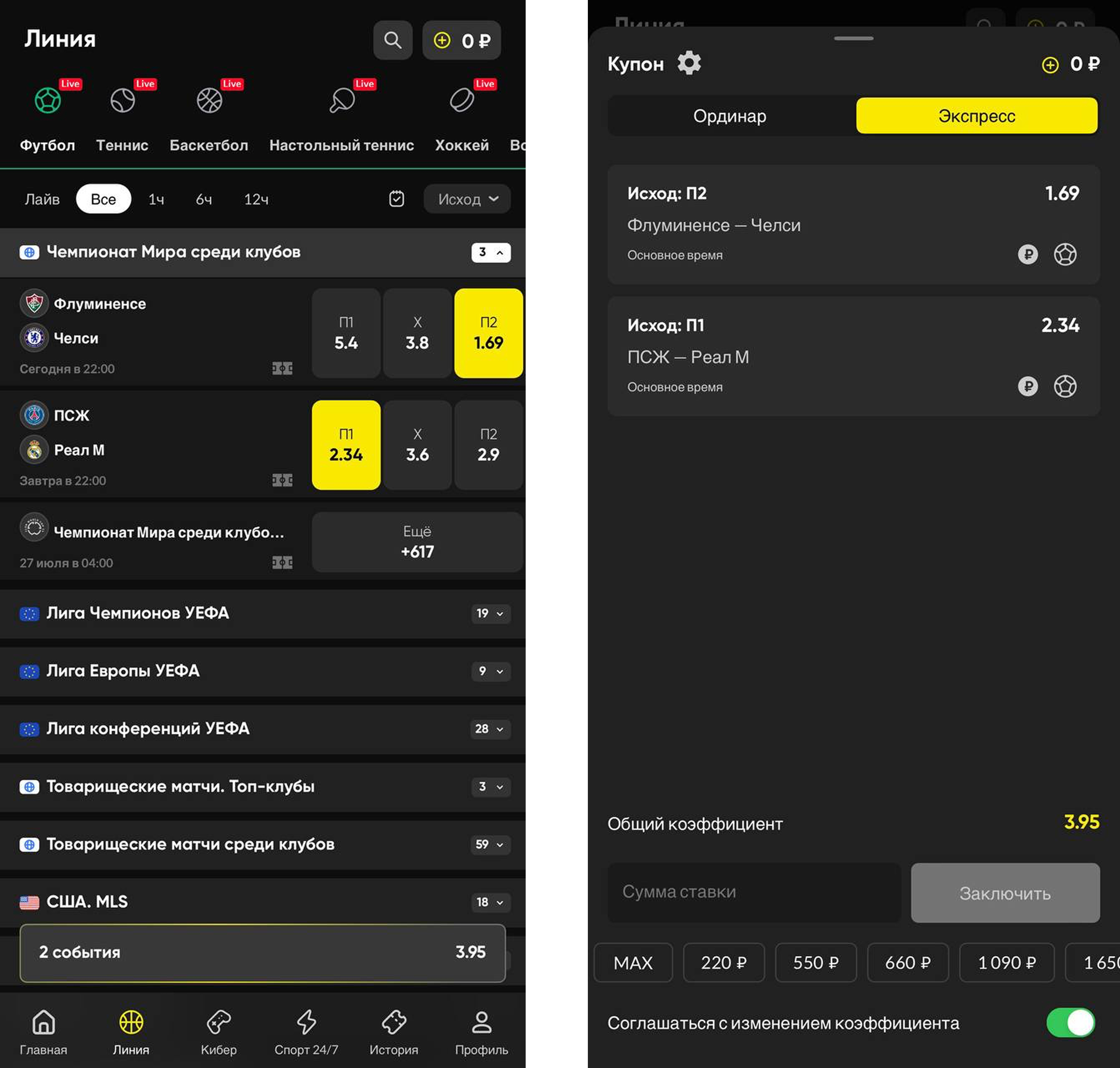 — Нет, процесс заключения ставок с разных устройств принципиально не отличается. Чтобы заключить пари, просто выполните событие, укажите сумму ставки, при необходимости настройте купон и подтвердите действие.
