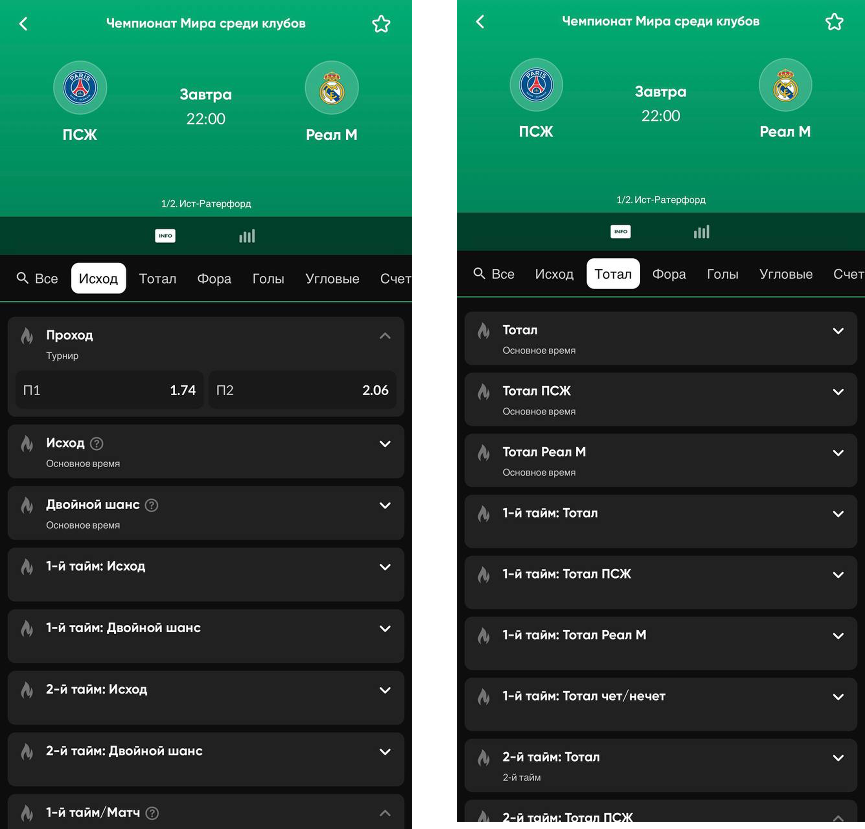 • Исход и тотал матча;