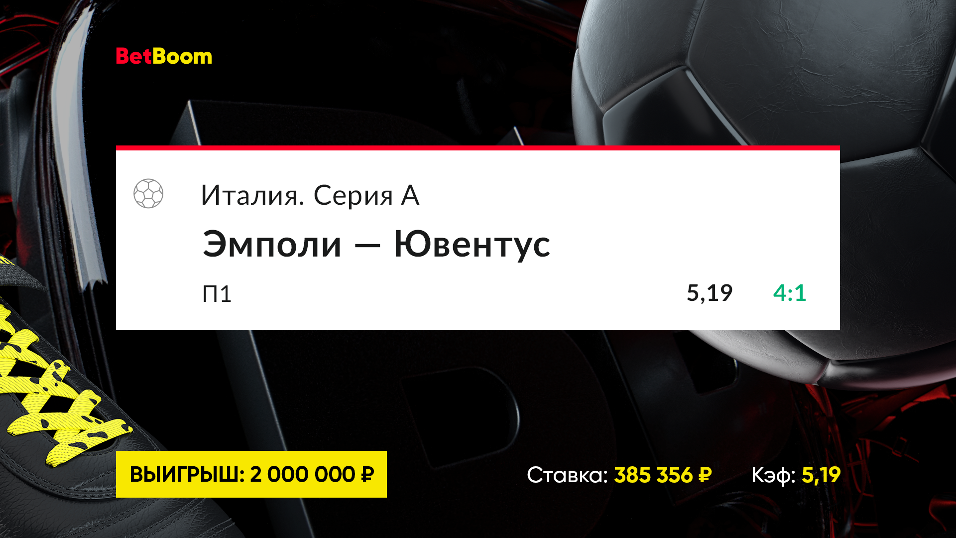 Деморализованные игроки «Ювентуса» пропустили четыре мяча от «Эмполи», но помогли выиграть клиенту BetBoom ровно 2 000 000 рублей