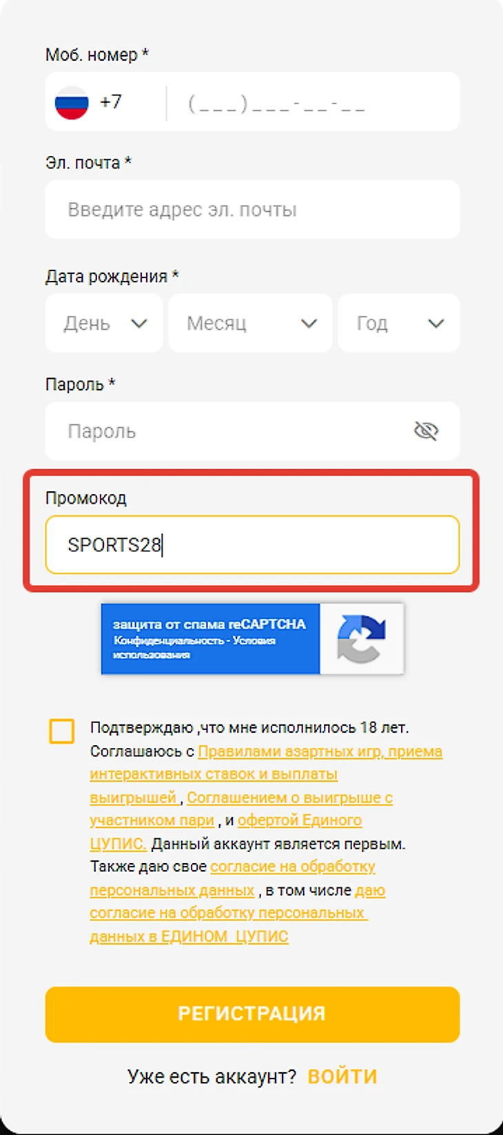 У букмекера довольно щедрое приветственное вознаграждение. Все клиенты получают 100% к сумме пополнения от 1000 рублей. Базовое ограничение бонуса составляет 15 000 рублей, но при использовании промокода SPORTS28, размер вознаграждения возрастает до 28 000 рублей.