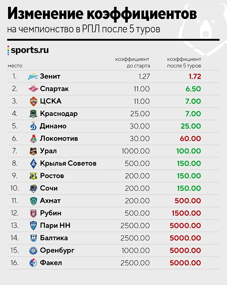 Коэффициент на чемпионство «Урала» рухнул в 10 раз, на «Зенит» – идет к 2.00