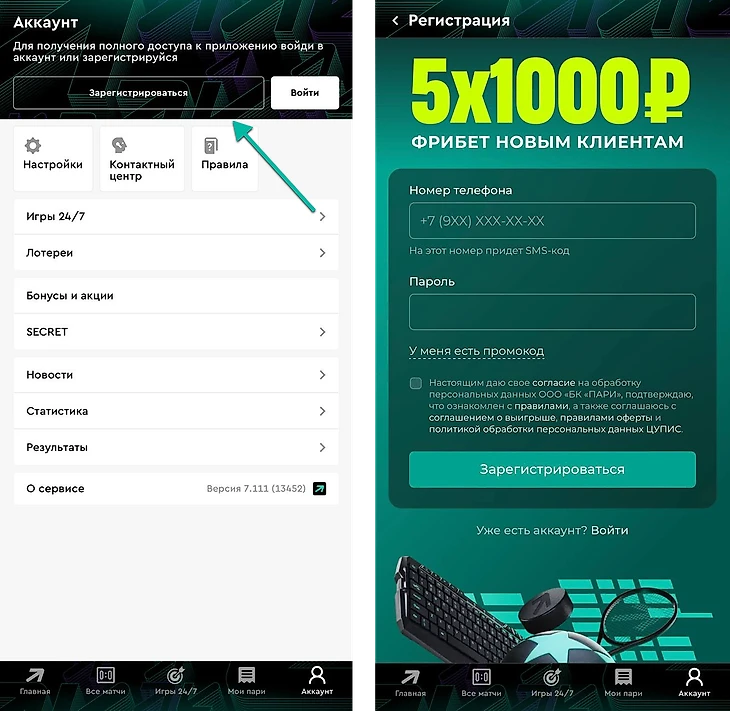 Алгоритм действий при регистрации через приложение БК схожий с тем же, что и через официальный сайт: