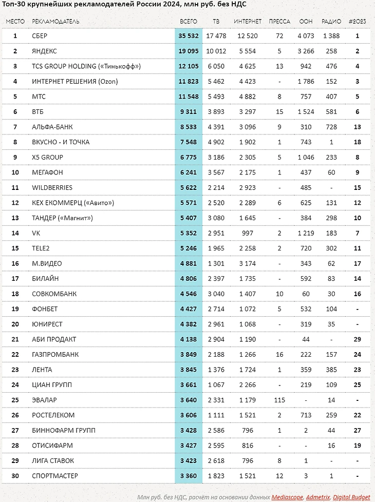 Крупнейшим рекламодателем России в 2023 году стал «Сбер» (35,5 млрд рублей). В топ-3 также вошли «Яндекс» (19 млрд) и «Тинькофф» (12,1 млрд).