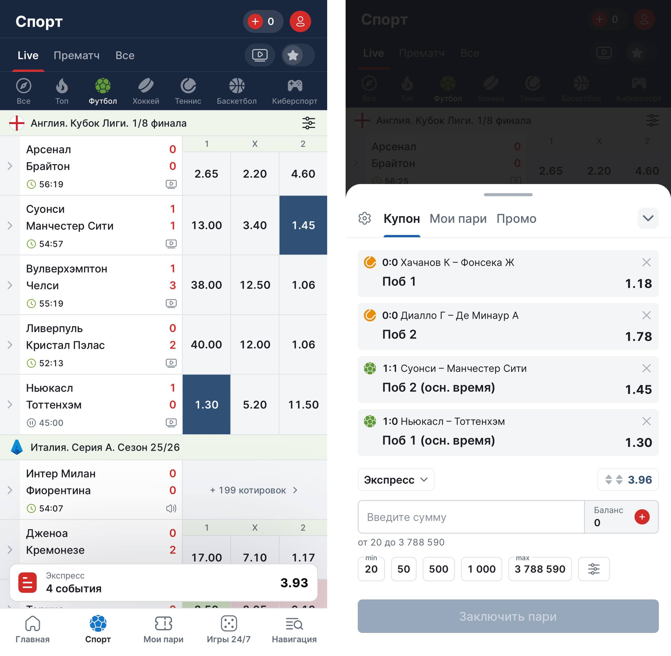 Процесс заключения лайв-пари в БК очень простой и интуитивно понятный: