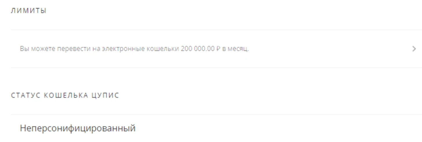 После того как вы зарегистрировались в Едином ЦУПИС (прохождения первого этапа верификации вашего аккаунта) вам присваивается неперсонифицированный статус кошелька. Вам будут доступны следующие лимиты:
