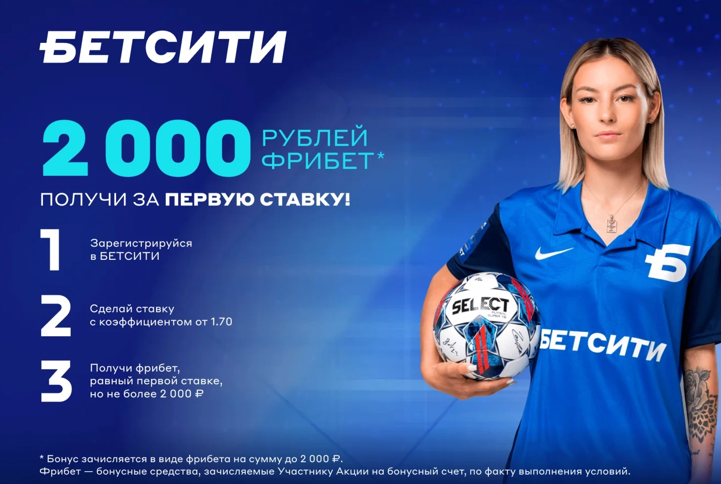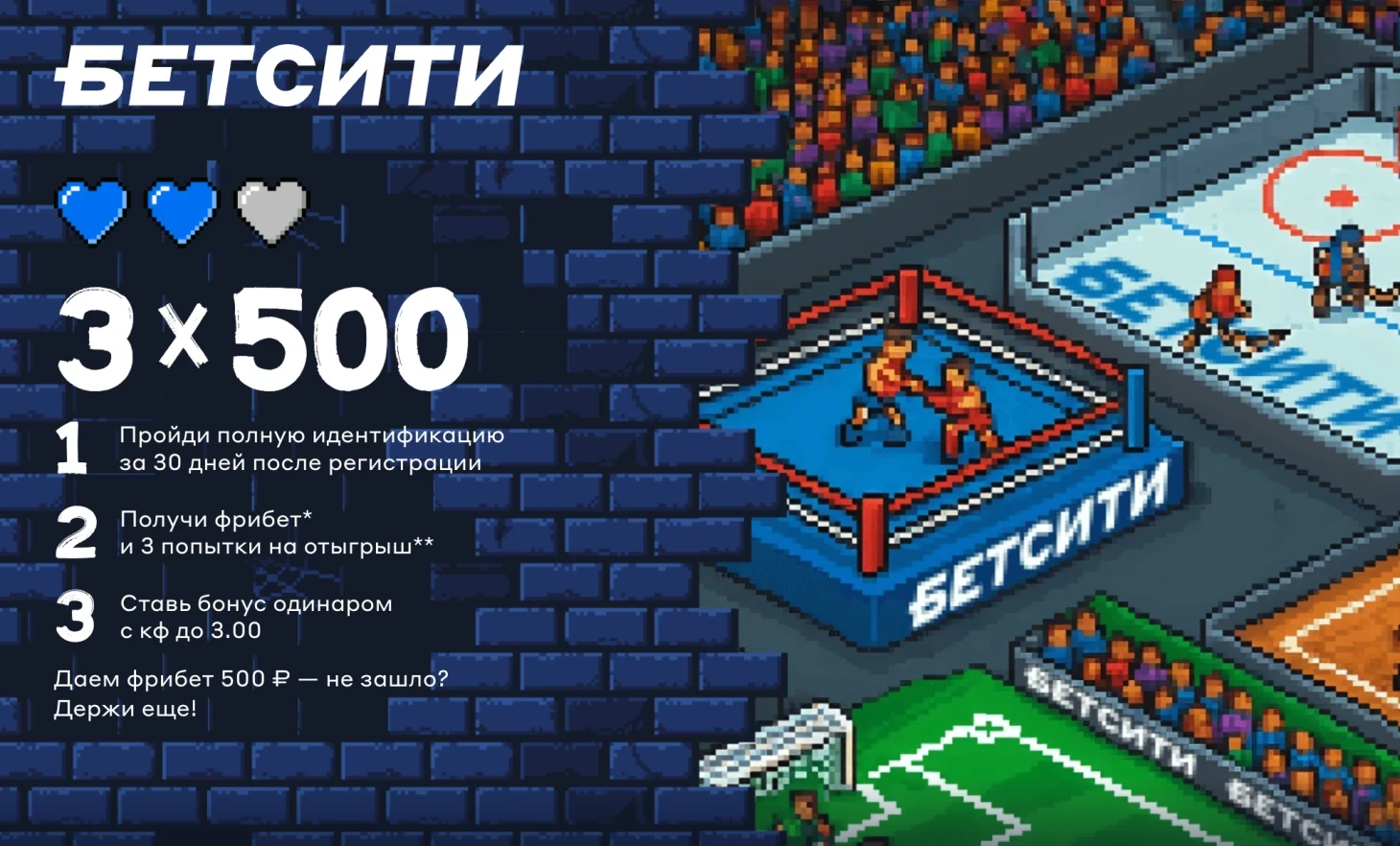 «БЕТСИТИ» дарит новым клиентам до трёх фрибетов по 500 рублей. Для получения первого фрибета нужно зарегистрироваться с промокодом и пройти идентификацию в течение 30 дней. Условия использования: каждый фрибет действует 7 дней, ставится на ординары с коэффициентом 2.00-3.00 (кроме быстрых игр). Второй и третий фрибеты начисляются автоматически только в случае проигрыша предыдущего. При выигрыше на счёт поступает чистая прибыль за вычетом суммы фрибета.