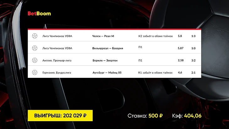Еврокубки и регулярные чемпионаты вернулись после перерыва на сборные. Клиент BetBoom собрал экспресс из 4-х событий, поставив 500 рублей на матчи Лиги чемпионов, АПЛ и Бундеслиги с коэффициентом 404,06, и выиграл 202 тысячи рублей! В качестве маркетов беттор выбрал исход и голы команд в обоих таймах.
