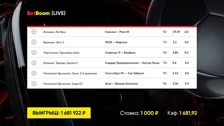 Клиент BetBoom собрал экспресс в лайве из шести футбольных матчей с коэффициентом 1681,92 и выиграл 1,6 миллиона рублей! Он поставил тысячу рублей на исходы вечером в воскресенье.