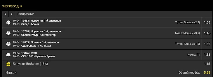 Напомним, что в «BetBoom» продолжается акция «Экспресс дня». Каждый день букмекер предлагает 5 новых экспрессов, итоговый коэффициент которых умножается на 1,15. Подробности по ссылке