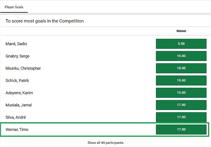 Букмекерские конторы подсуетились и оперативно выкатили линии на Вернера в борьбе за звание лучшего бомбардира: «1хСтавка», например, на победу Тимо в гонке снайперов дает коэффициент 15.00 (около 6%), а европейская контора Unibet верит в успех Вернера на родине еще меньше — 17.00 (5%).