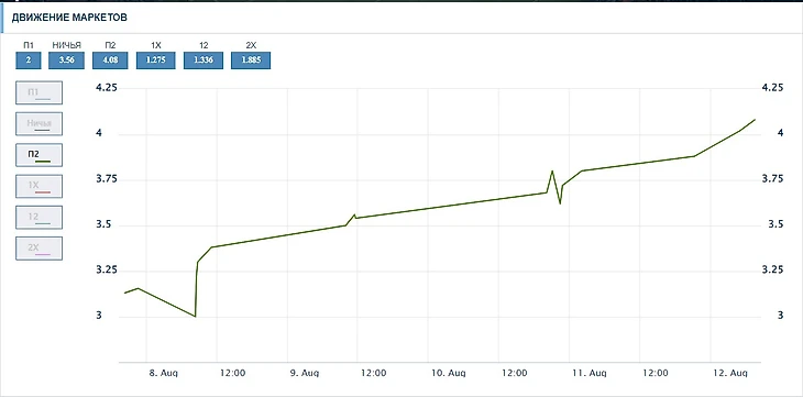 8 августа до официального объявление об отставке Шалимова коэффициент на победу «Урала» держался на отметке 3.00, но в день матча исход уже котируют за 4.08. Кэф вырос на 26% за четыре дня.