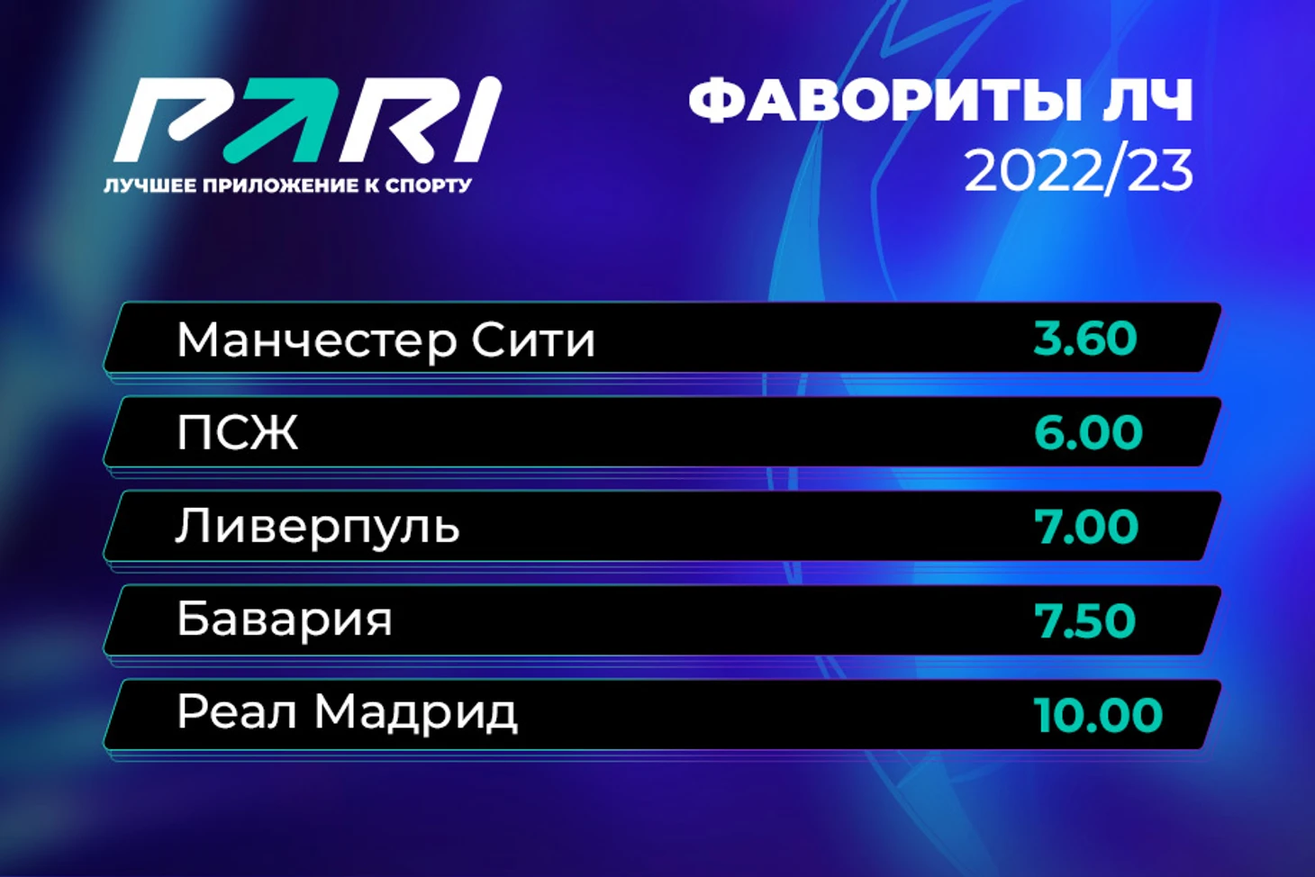 Согласно оценке аналитиков PARI, самые высокие шансы стать лучшим клубом Европы имеет английский «Манчестер Сити». Поставить на то, что подопечные Хосепа Гвардиолы наконец-то добьются заветной победы в Лиге чемпионов, можно по коэффициенту 3.60. «Горожане» каждый сезон входят в число главных фаворитов турнира, но они еще ни разу в нем не побеждали. Клуб был максимально к этому близок в 2021 году, когда в финале уступил «Челси».