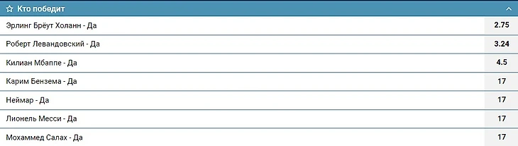 Перфоманс Левандовски в первом туре заставил аналитиком пересмотреть свои взгляды на борьбу за звание лучшего бомбардира Лиги чемпионов. Во вторник двумя главными претендентами были Холанд и Мбаппе, а шансы Роберта оценивались менее чем в 10%, но сейчас поляк оставил позади молодого француза: на то, что Левандовски станет лучшим снайпером ЛЧ дают коэффициент 3.24, то есть около 30%.