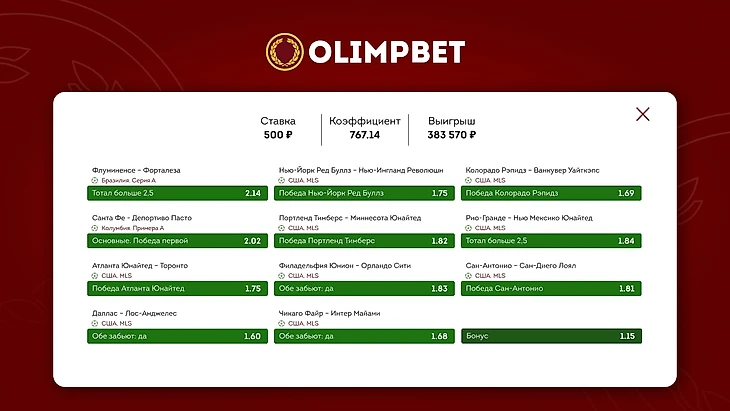 Клиент Olimpbet собрал мощный экспресс с общим коэффициентом 767.14. Игрок добавил в купон 11 матчей из чемпионатов Бразилии, Колумбии, а также первой и второй лиг США.