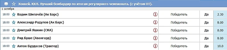 Однако фаворитом бомбардирской гонки в «регулярке» все еще считает Шипачев – шансы на победу форварда чуть больше 40%. У Радулова, к примеру, всего 12%.