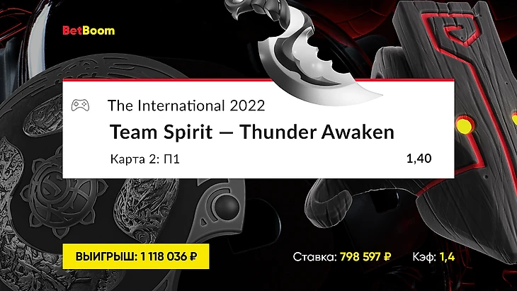 Весьма рискованную ставку сделал клиент букмекерской компании BetBoom — он поставил почти 800 000 рублей на победу во второй карте команды Team Spirit над Thunder Awaken в рамках группового этапа The International 2022 по Dota 2. Коэффициент ставки составил  всего 1,40, но беттор выиграл 1 118 036 рублей.