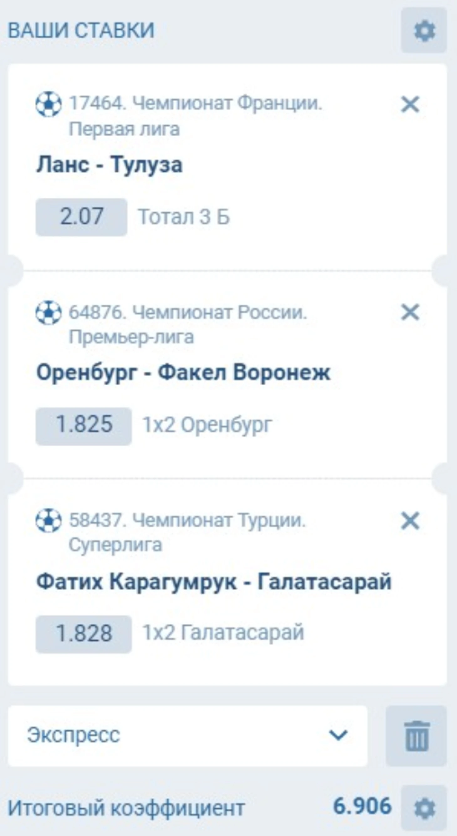 На скриншоте ниже – экспресс из 3 событий, одно из которых в теории может пойти под возврат. Это ставка на ТБ 3 в матче «Ланс» – «Тулуза» за коэффициент 2.07. Если в указанном поединке команды забьют ровно 3 гола, событие будет рассчитано с коэффициентом 1.0. Тогда общий коэффициент «паровоза» снизится с 6.9 до 3.33. Соответственно, потенциальный выигрыш также уменьшится.