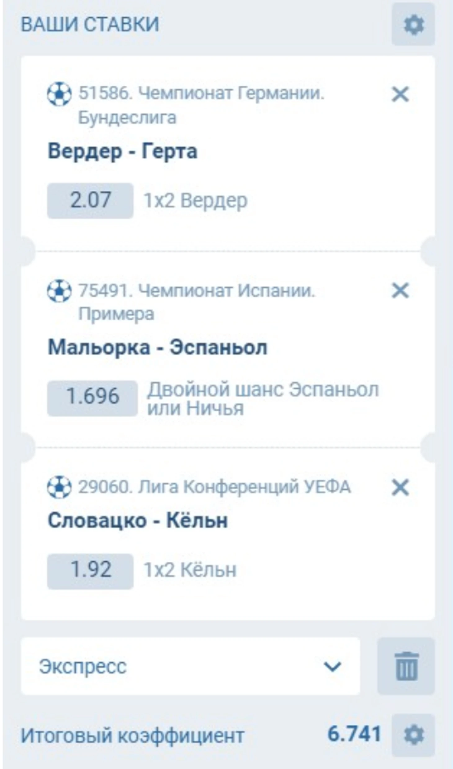 Все коэффициенты в экспрессе перемножаются. Итоговый кэф отображается в купоне, равно как и потенциальная сумма выигрыша. Она определяется умножением суммы ставки на общий коэффициент. Например, вы составили экспресс из трех событий с котировками 2.07, 1.69 и 1.92. Общий коэффициент – 6.74. При ставке в 1000 р. потенциальный выигрыш будет равняться 6740 р., а при ставке в 1500 р. вы сможете выиграть 10 111 р.