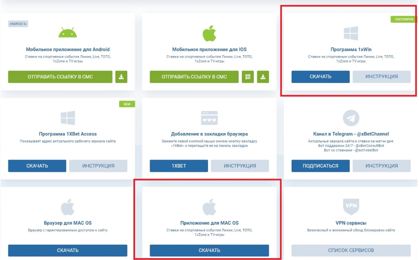 Пролистайте главную страницу 1xbet.com (или зеркала) в самый низ. Там будет кнопка «Другие приложения». Откроется страница с ссылками на все доступные приложения БК, а также иные способы обхода блокировки. Выберите нужную версию программы в зависимости от ОС вашего компьютера, загрузите ее и выполните установку.