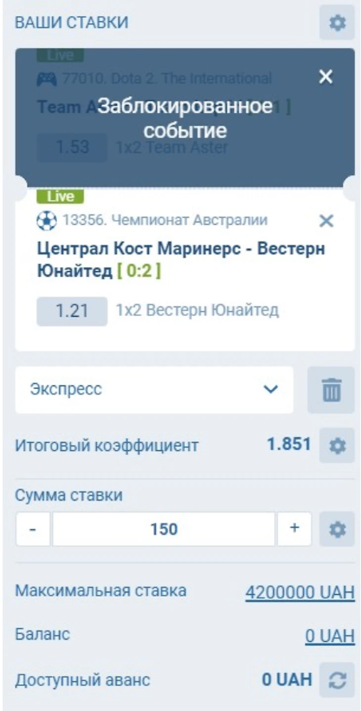 Около одного или нескольких исходов в купоне может появиться надпись «Заблокировано событие». Это значит, что БК проводит пересчет коэффициентов – возможно, в матче произошло знаковое событие (например, забит гол или показана красная карточка). Через несколько секунд событие, скорее всего, вновь станет доступно для включения в экспресс, правда, коэффициент может значительно измениться. Чаще всего события блокируются в режиме Live.
