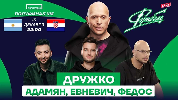 13 декабря 2022 года выйдет очередной выпуск стрим-шоу «Футболь» , звездные участники которого Сергей Дружко, Карен Адамян, Федос Маслов и Евгений Евневич в прямом эфире обсудят события полуфинала чемпионата мира в Катаре между сборными Аргентины и Хорватии.