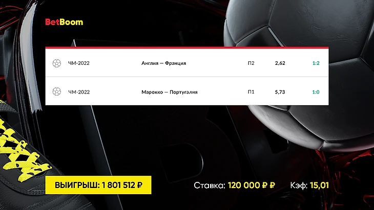 Во втором матче клиент BetBoom поставил на успех андердогов в лице Марокко в матче против Португалии. Криштиану Роналду разрыдался после поражения, ведь это, вероятно, последний чемпионат мира в карьере 37-летнего португальца. Но для беттора это плюс 1 801 512 рублей на счету!