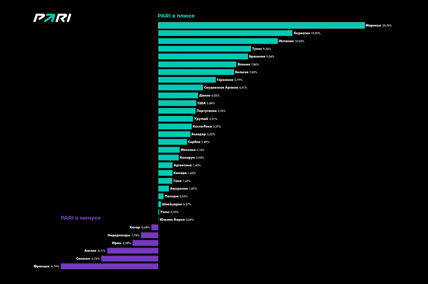 Самой прибыльной командой для PARI стала главная сенсация ЧМ – сборная Марокко – матчи с участием этой команды обеспечили около 21% прибыли компании суммарно по итогам мундиаля. А самым успешным матчем с участием Марокко стала встреча этой команды с Испанией – из всех матчей, которые провели марокканцы, больше всего прибыли PARI зафиксировали по итогам данной встречи (около 36% всех встреч марокканцев, проведенных за время ЧМ). На матч Марокко – Португалия пришлось 29% от всей прибыли африканской команды.