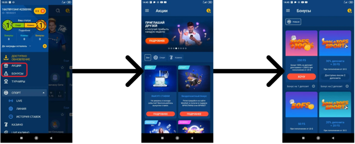 БК “Mostbet” регулярно проводит акции для своих клиентов и дарит различные бонусы. В меню приложения есть отдельные вкладки: “Акции”, “Бонусы” в которых собраны все текущие предложения: