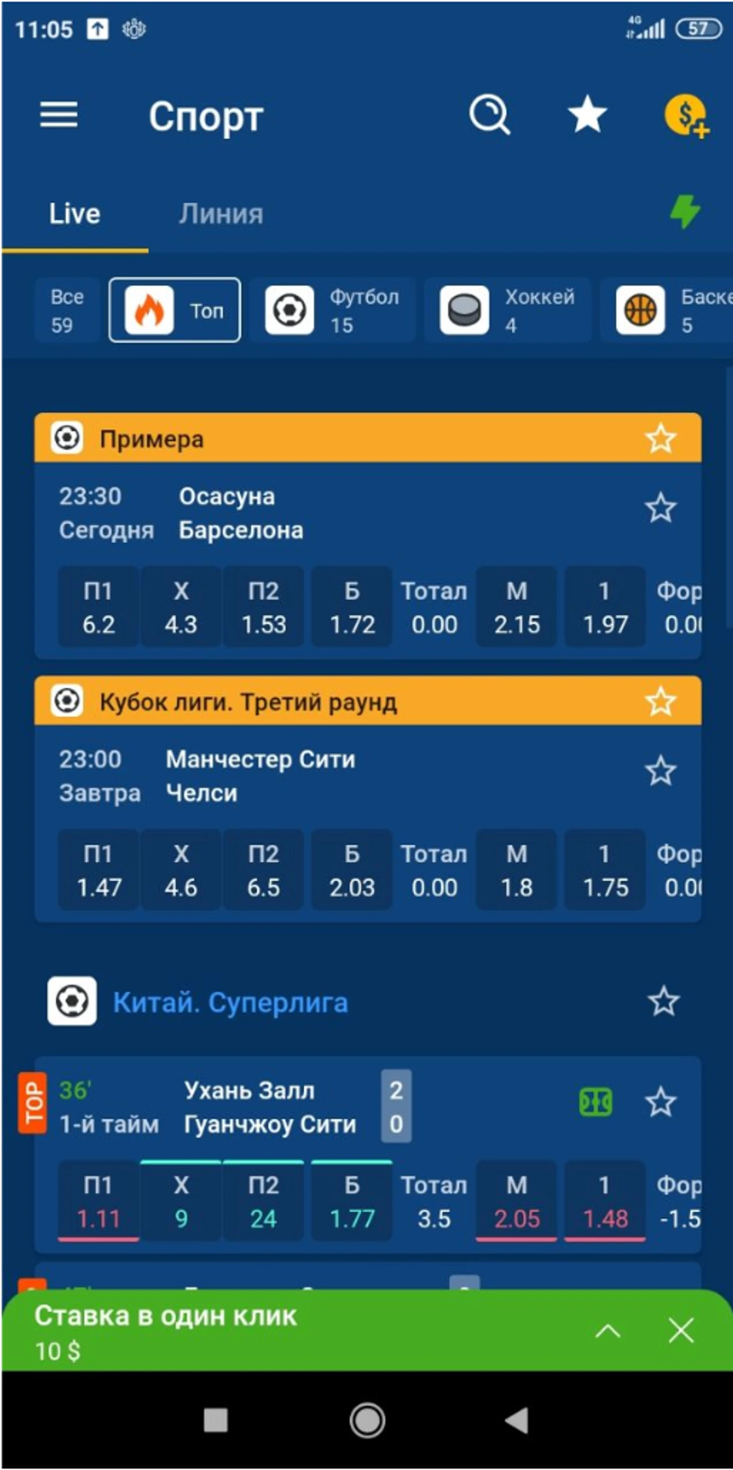 Live. Тут располагаются все текущие спортивные события. В меню есть возможность переключения в режим “Линия”. В верхней части экрана находится окно для удобного поиска соревнования, опция пополнения баланса, возможность сделать ставку в один клик, а также добавить событие в избранное. Ниже расположена лента выбора вида спорта. В центре экрана находятся карточки текущих спортивных событий.