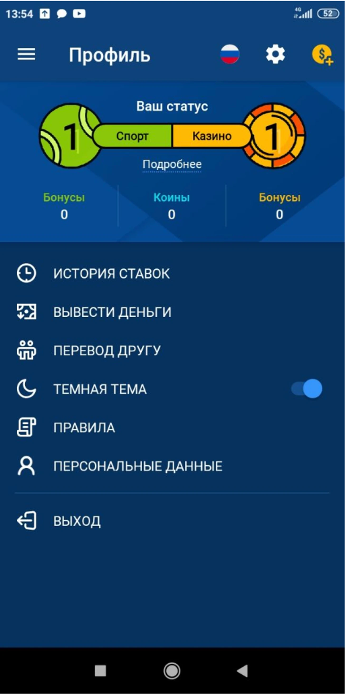 Профиль. Это ваш личный кабинет, в котором отображается ваш текущий статус, согласно программам лояльности, а также количество бонусов и “мостбет-коинов”. В верхней части экрана вы можете настроить приложение для себя и выбрать язык, также вверху доступна опция пополнения счета. Ниже располагаются следующие вкладки: