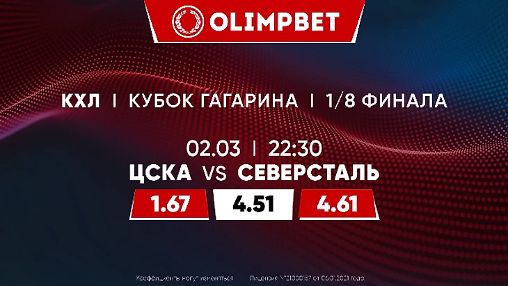 Olimpbet практически не сомневается в итоговом превосходстве столичного клуба: проход «Северстали» – 6.29, проход ЦСКА – 1.12. Явные фавориты «армейцы» и в первом матче серии: П1 – 1.67, Х – 4.5, П2 – 4.6.