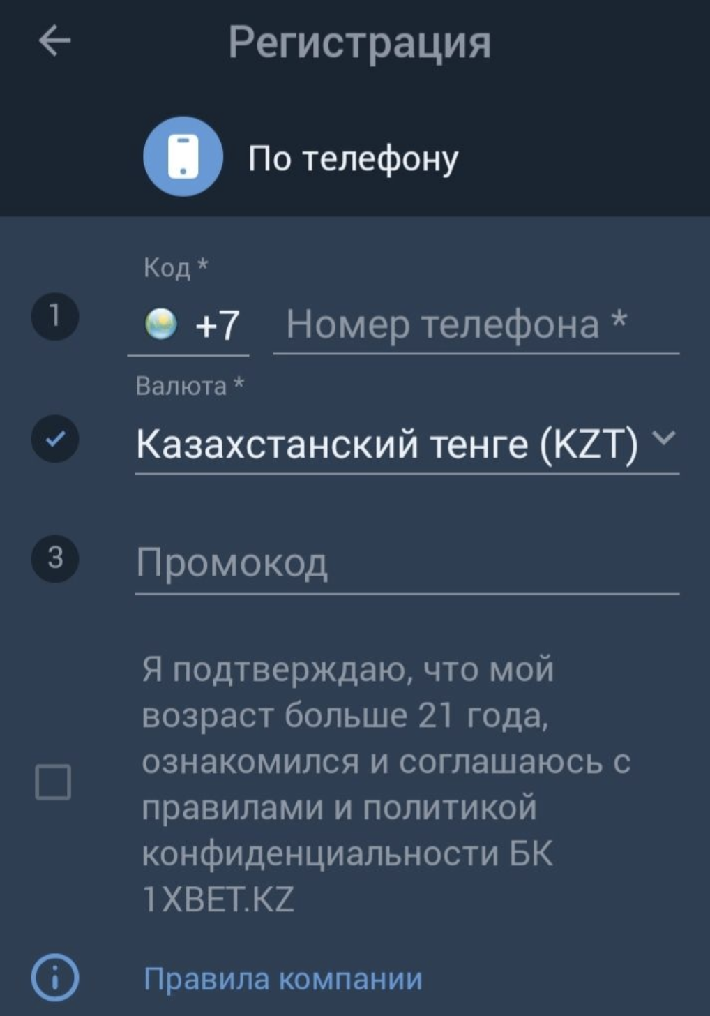 При наличии промокода заполняем поле «Промокод». Есть его нет, то оставляем пустым. Далее даем согласие с правилами работы букмекерской конторы и завершаем процедуру. Зарегистрировать можно только в возрасте от 21 года.