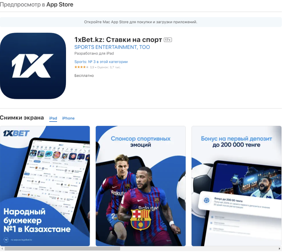 Каждый из предложенных вариантов приведет на страницу приложения 1xBet.kz: Ставки на спорт в магазине App Store. На странице находится информация о программе: