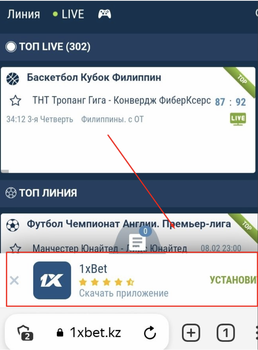 Скачать приложение на телефон можно через мобильную версию сайта. Она открывается автоматически при переходе по адресу 1xbet.kz в любом браузере смартфона. На главной странице появится баннер «1xBet Установить». При нажатии на него произойдет переход на страницу с установочным файлом.