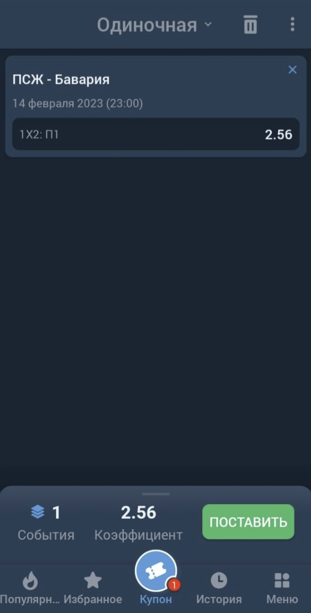 После подтверждения ставки, событие отправляется в раздел «История».