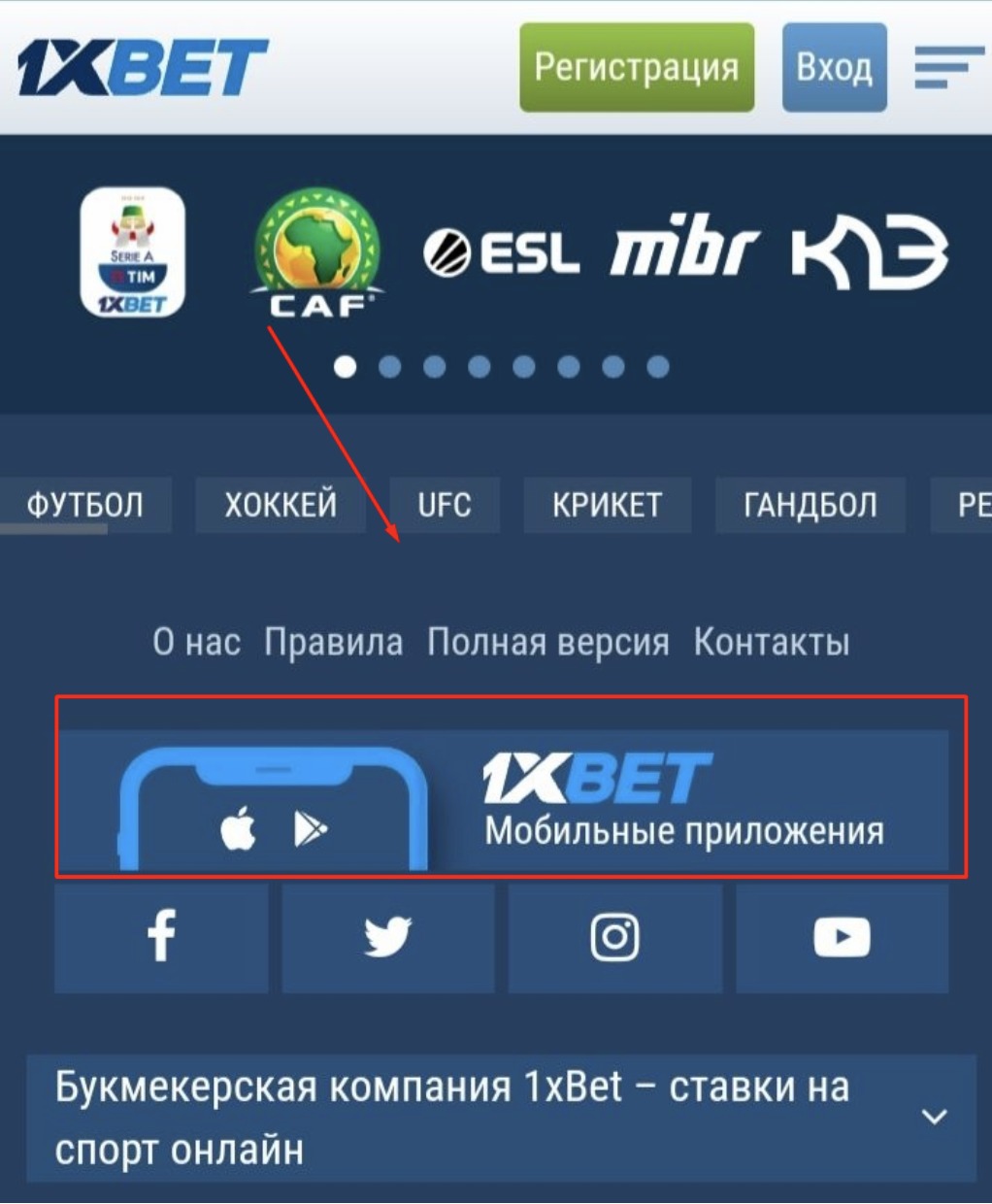 Если баннер не появился, то необходимо опуститься в футер страницы и найти блок «1xBet Мобильные приложения».
