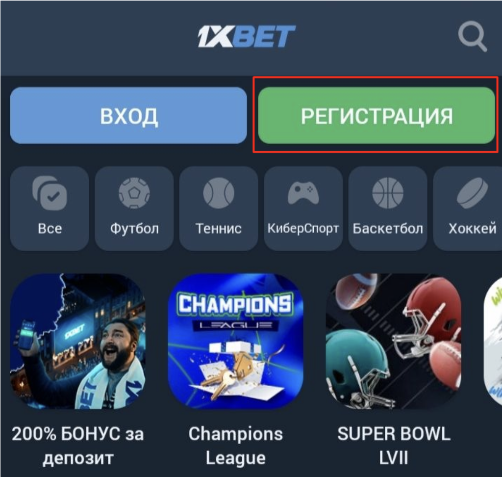 В приложении «1хБет» доступна регистрация только по номеру телефона. Для создания учетной записи необходимо нажать на кнопку «Регистрация» на главной странице.