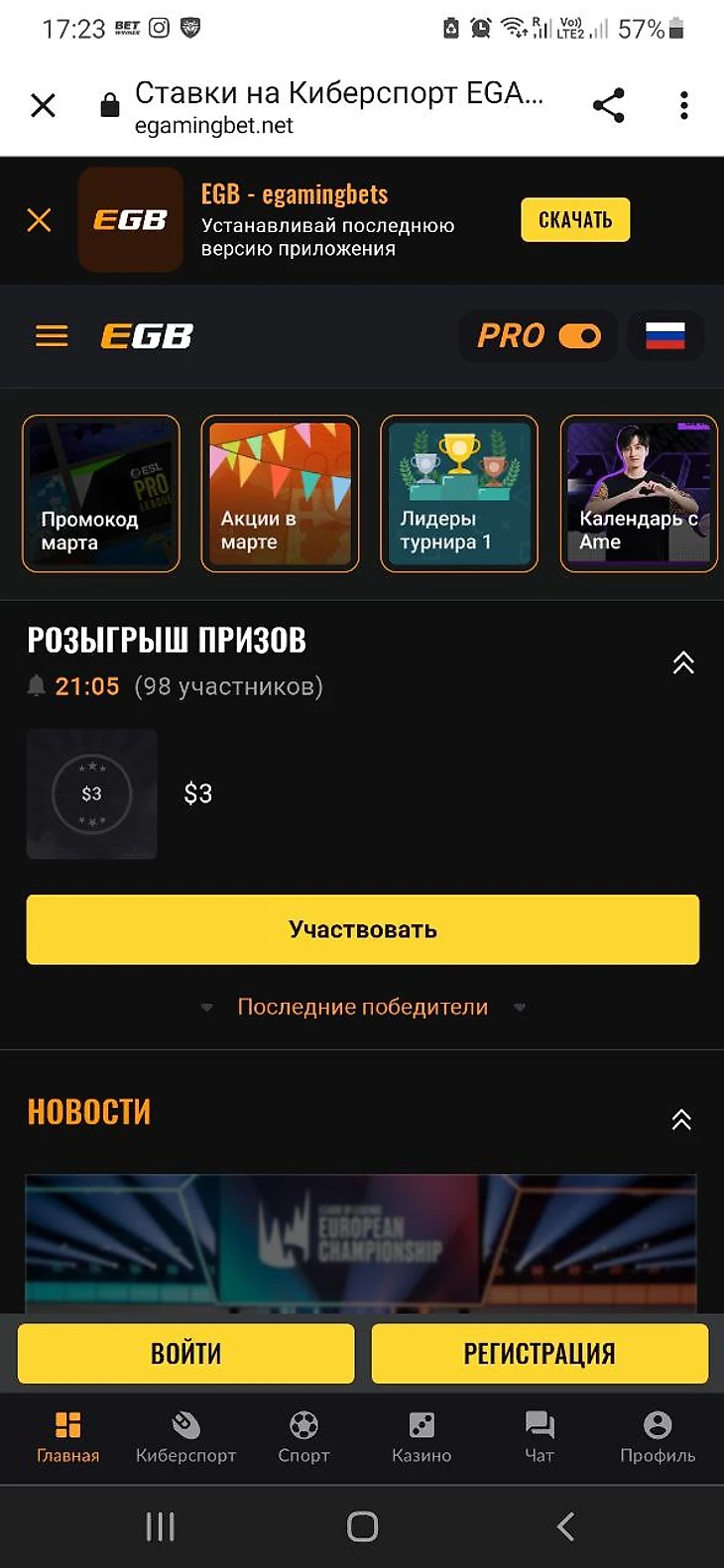 Букмекер EGB работает в онлайне с 2011 года. Изначально контора специализировалась только на ставках на киберспорт. Со временем на сайте egb.com появились разделы спортивных ставок (правда, выбор событий совсем невелик) и онлайн-казино. Играть можно на сайте, через зеркало или официальные приложения для iOS и Android. Есть возможность открыть демо-счет с условной валютой. EGAMINGBET.NET – официальное зеркало EGB.com.