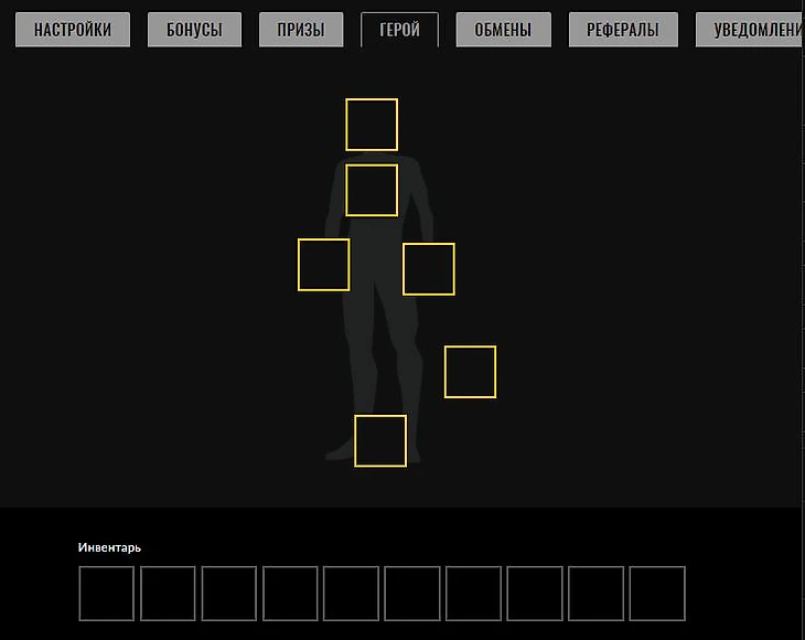 В категории «Мой герой» можно увидеть свой инвентарь. Скины бывают двух типов: их можно одеть на своего героя для получения определенных бонусов либо же для улучшения интерфейса сайта.