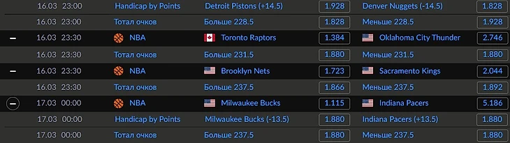 Еще хуже ситуация обстоит с традиционным спортом. В линии букмекера представлены лишь 7 дисциплин – футбол, баскетбол, теннис, хоккей, дартс, снукер и бейсбол. Можно увидеть и поставить только на матчи на ближайшие 24 часа. Выбор турниров – очень скромный: только топ-соревнования вроде футбольной Лиги Европы или НБА. Но даже в этих турнирах выбор ставок не достигает и 10 рынков. На скриншотах ниже – роспись на несколько поединков Лиги Европы и матчи НБА.