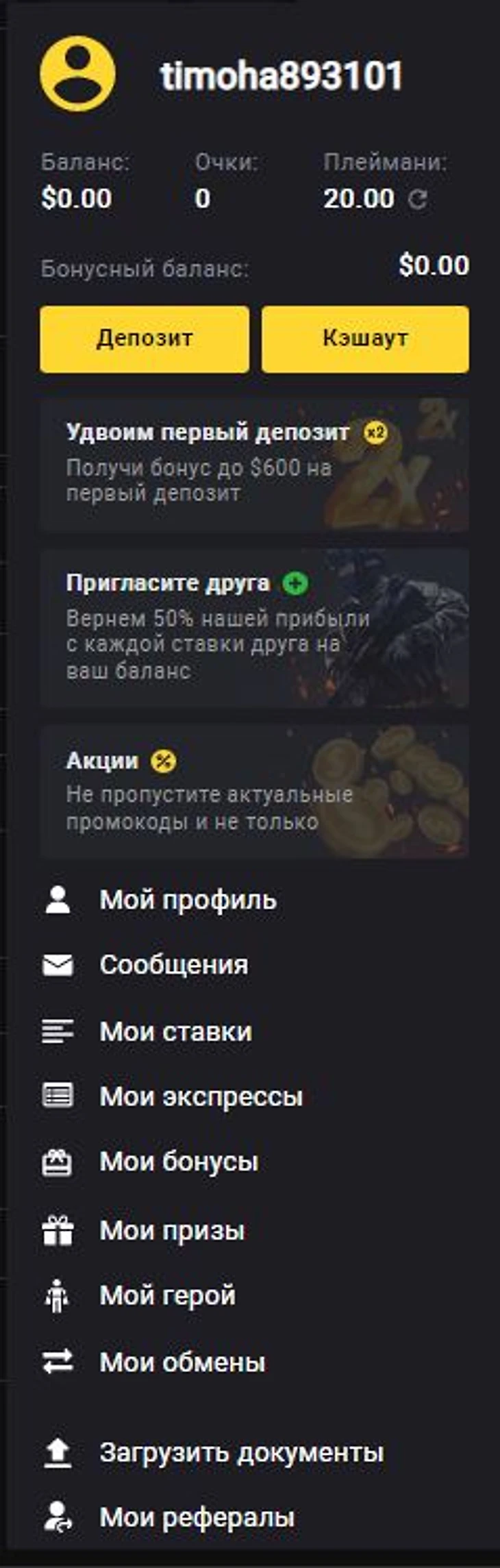 В личном кабинете беттер, помимо загрузки документов для идентификации, может выполнять множество других действий. На вкладке «Мой профиль» можно дополнить или изменить личные данные, пройти процедуру самоисключения или установить себе лимиты на пополнение. Есть кнопки для внесения депозита и вывода средств, для просмотра истории ставок, бонусов и транзакций и многие другие. В «Акциях» вы увидите все доступные бонусные предложения.