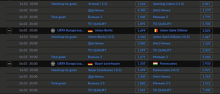 Роспись на 3 матча ЛЕ. В каждом из них предлагается по 4 варианта ставок, кроме основных исходов