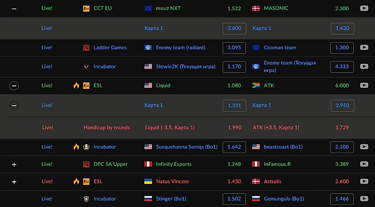 Live-раздел в разделе «Спорт» присутствует на сайте «для галочки». На момент написания обзора в нем не было ни одного матча, хотя другие букмекерские конторы в это же время предлагали множество поединков для ставок. В киберспорте ситуация получше – некоторые игры из прематча переходят в лайв. Роспись не превышает 5-7 рынков, а в некоторых поединках предлагается ставить только на основные исходы.