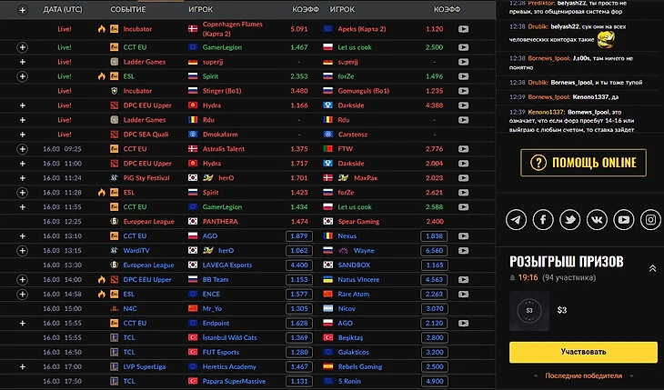 Центр домашней страницы занимают линия и ссылки на стримы. На правой вертикальной панели – чат беттеров, под ним – кнопка вызова онлайн-чата саппорта, ссылки на соцсети, розыгрыш призов, который проводится регулярно. Также здесь продублированы разделы из верхнего меню: новости, акции, маркетплейс.