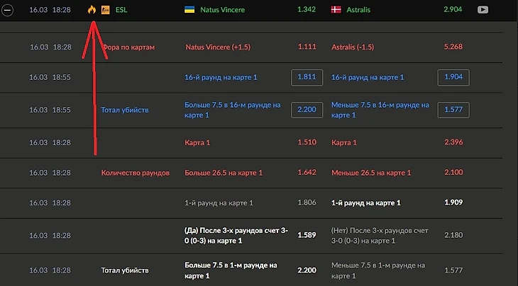 Охват турниров в представленных дисциплинах оставляет желать лучшего – БК предлагает только основные соревнования. Роспись – не более 20 вариантов, и это на топ-матчи вроде «зарубы» NAVI и Astralis в рамках ESL League по CS:GO. Такие события в линии помечены иконкой огня, что означает «Важный матч».