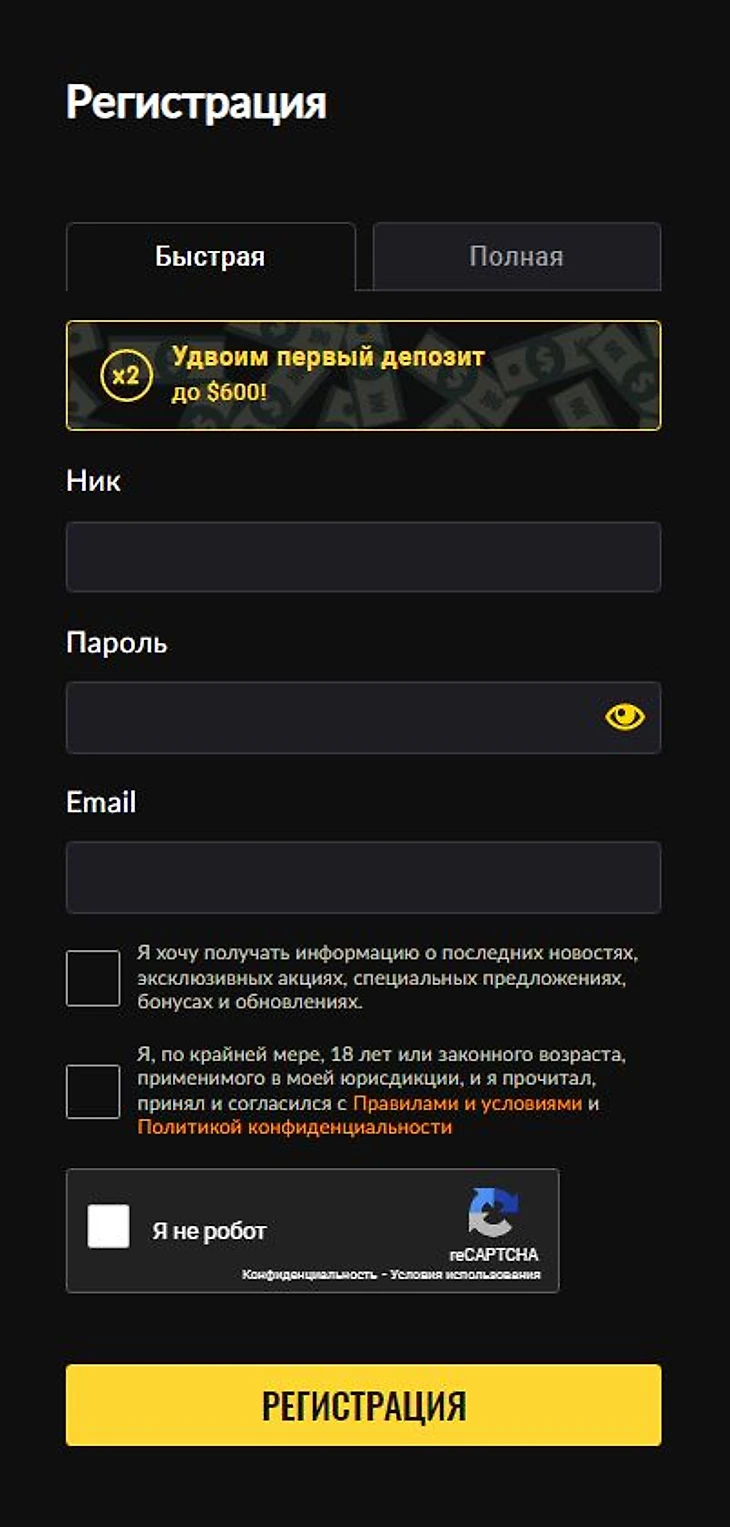 В форме создания аккаунта первым делом нужно выбрать тип регистрации – быстрая или полная. Разница – в количестве указываемых данных. При быстрой регистрации достаточно ввести лишь э-мейл, никнейм и пароль, при полной – также выбрать страну, указать ФИО и дату рождения. В завершении нужно подтвердить согласие с правилами компании и нажать «Регистрация».