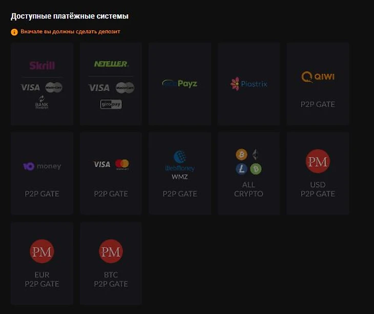 Выводить деньги можно только теми способами, которыми ранее совершался депозит. До этого все методы оплаты будут неактивными. Если использованный для депозита способ не предусматривает возможность снятия, контора разрешит воспользоваться альтернативной платежкой.