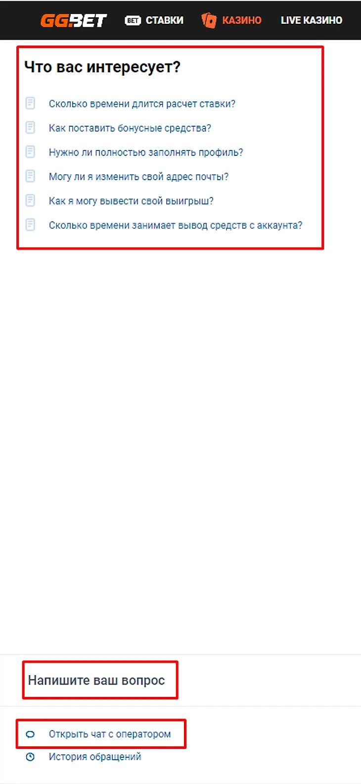 У букмекерской конторы GGBET несколько каналов, по которым можно связаться со службой поддержки. На сайте букмекера есть онлайн-чат. Можно использовать ответы на часто задаваемые вопросы или написать оператору и получить ответ от него.